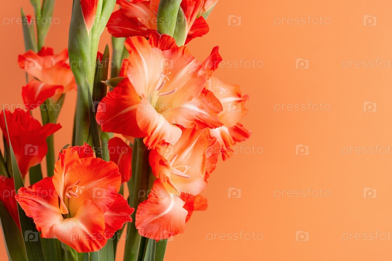 Открытка с оранжевыми гладиолусами на оранжевом фоне с копией пространства