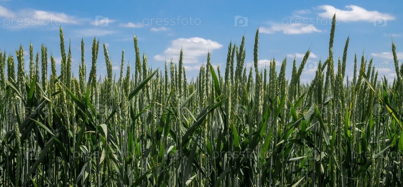 Колоски зеленой незрелой пшеницы крупным планом, на фоне голубого неба