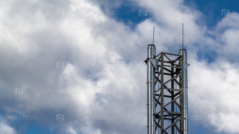 Блестящий металлический дымоход с громоотводами на фоне голубого неба с облаками