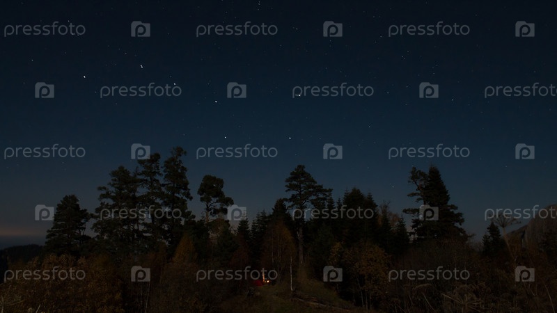 Созвездие Большой Медведицы в ночном небе в лесу. Костер в лесу