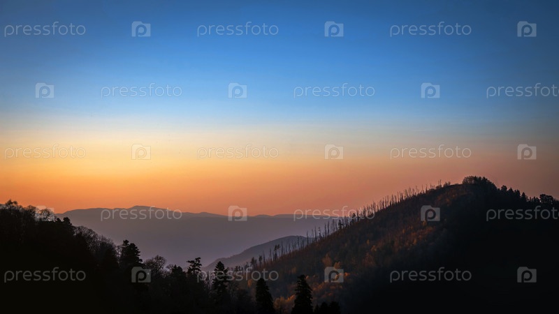 Мертвый лес на склоне горы освещен заходящим солнцем