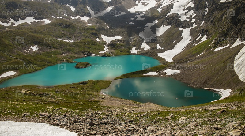Вид на Имеретинское озеро с высоты горной вершины. Голубое озеро в окружении гор и ледников
