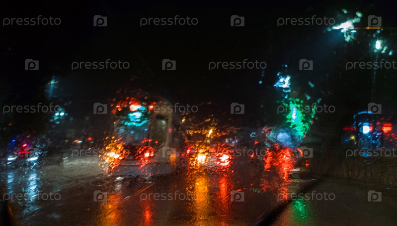 Вид через окно автомобиля во время дождя ночью. Размытые огни светофора, трамвая и автомобилей