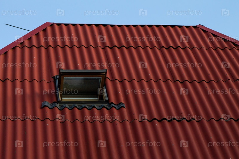 Окно встроено в красную шиферную крышу. Открытое мансардное окно