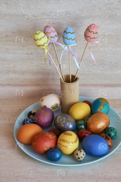 Праздничные пасхальные яйца и кулич на блюде