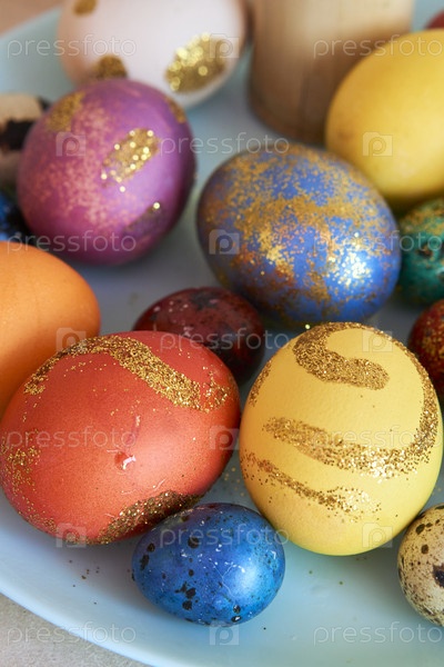 Праздничные пасхальные яйца и кулич на блюде