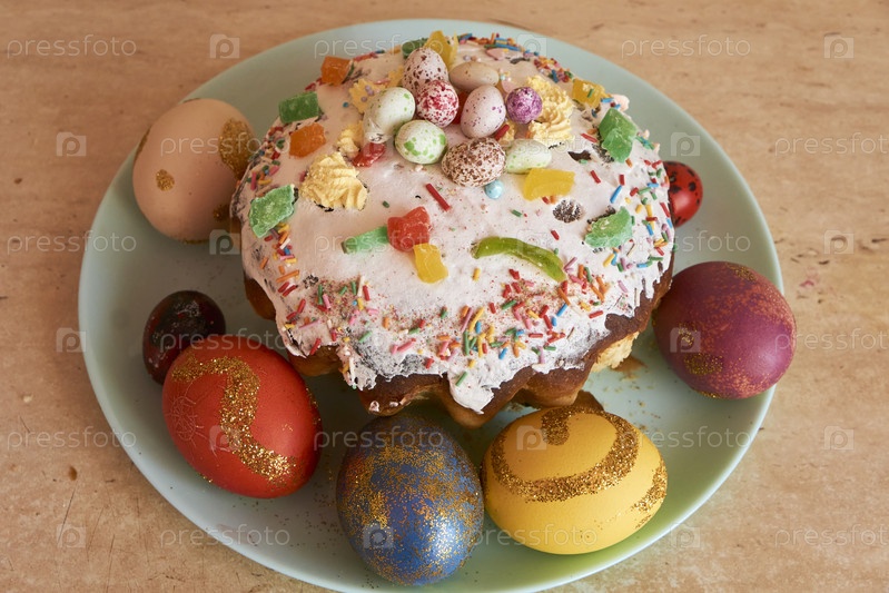Праздничные пасхальные яйца и кулич на блюде