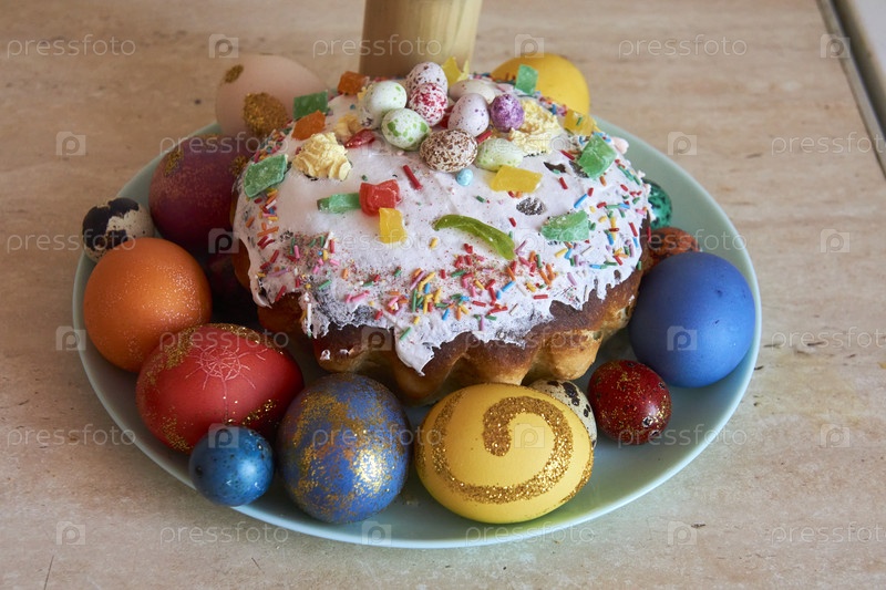 Праздничные пасхальные яйца и кулич на блюде