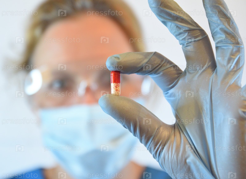 Женщина-фармацефт в маске и очках показывает красную пилюлю