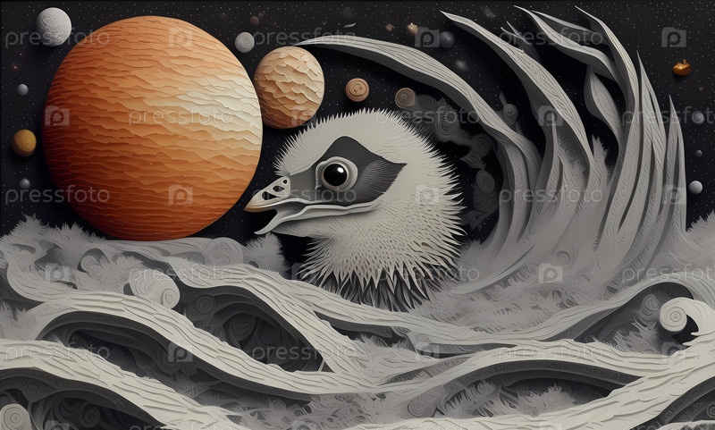 Бумажная аппликация птицы в чужом космическом пространстве. созданная с помощью искусственного интеллекта технология нашего будущего. Генеративный ИИ