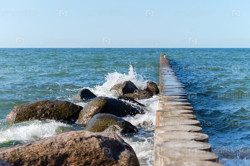 Морская волна разбивается о скалы. Волна на море и волнорез