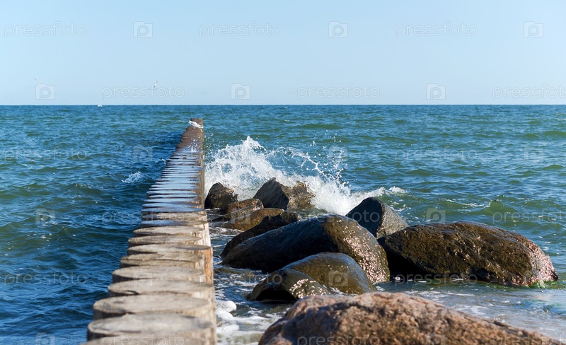 Морская волна разбивается о скалы. Волна на море и волнорез