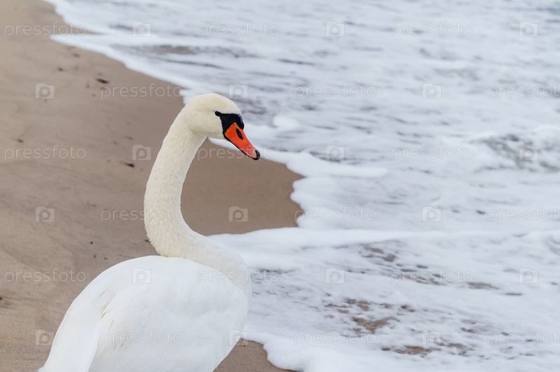 Лебедь на море. Белая птица на фоне песка. Белый лебедь