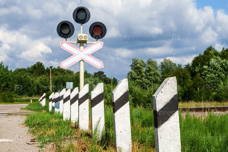 Красный светофор на железнодорожном переезде. Предупреждающий знак перед железнодорожным переездом. Внимание автомобилисты