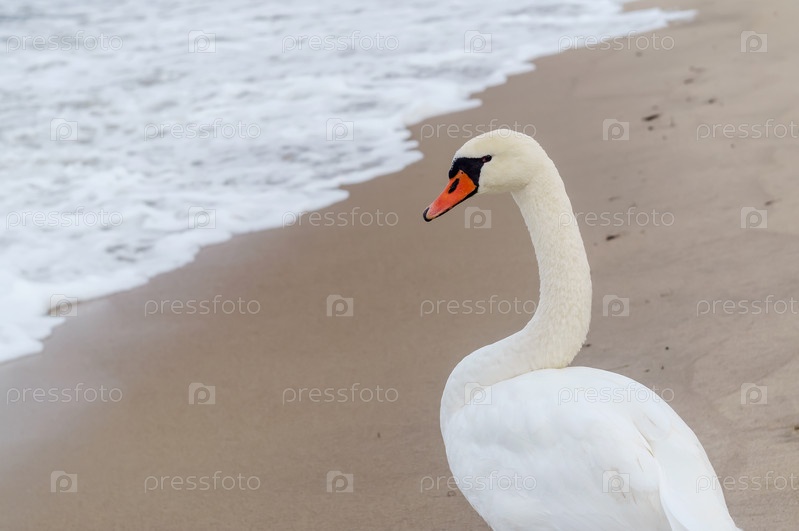 Лебедь на море. Белая птица на фоне песка. Белый лебедь