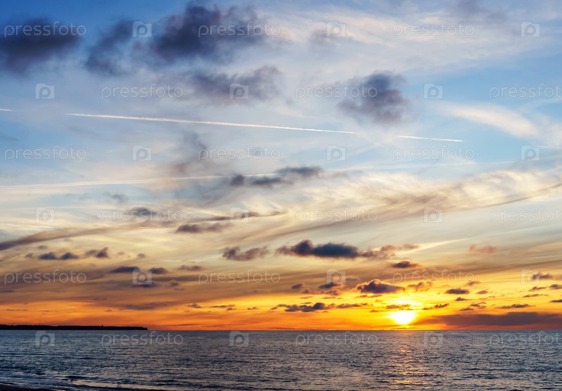 Закат над морем. Отражение солнечного света в морских волнах. Небо в закатных лучах. Балтийское море