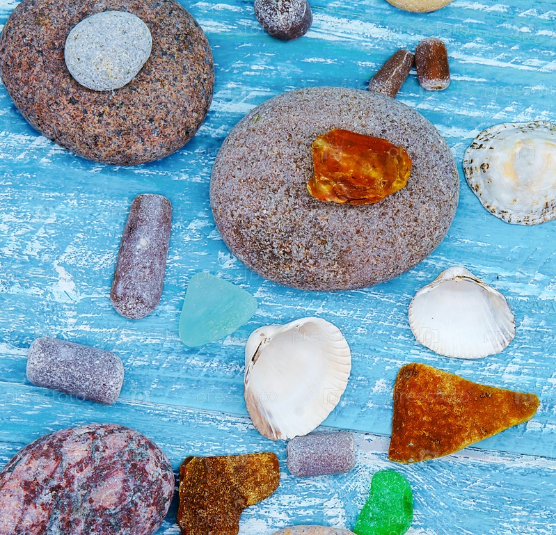Пирамида из морских камней на синем фоне. Морская галька и ракушки на столе