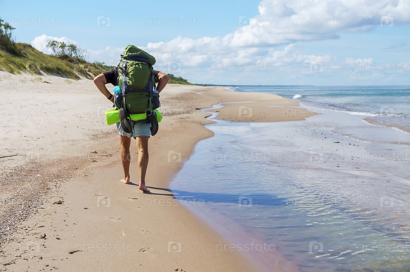 Турист идет вдоль морского побережья. Прогулка по берегу моря. Мужчина с большим рюкзаком
