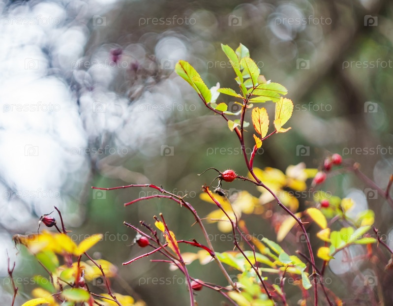 Осенний пейзаж. Ветка с пожелтевшими листьями. Ягоды и листья поздней осенью