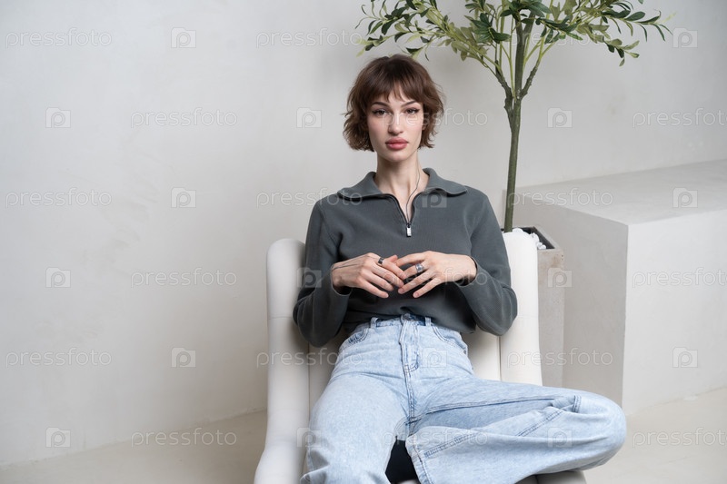 Молодая красивая женщина позирует в студии, сидя в синих джинсах на кресле