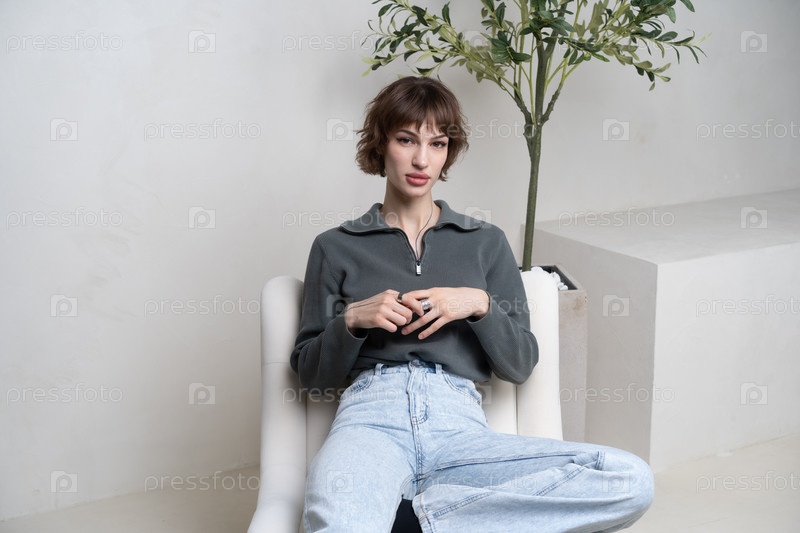 Молодая красивая женщина позирует в студии, сидя в синих джинсах на кресле