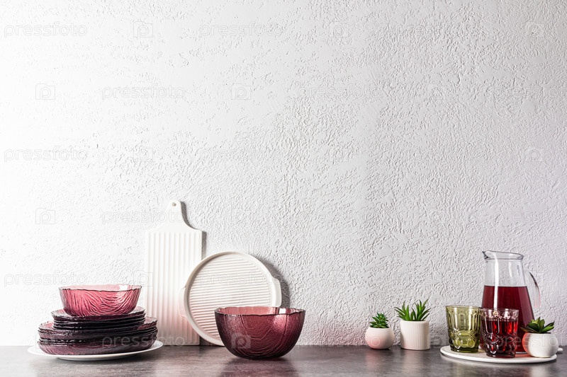 Модная современная посуда бордового цвета и кувшин виноградного сока на кухонной столешнице с копией пространства. кухня фон