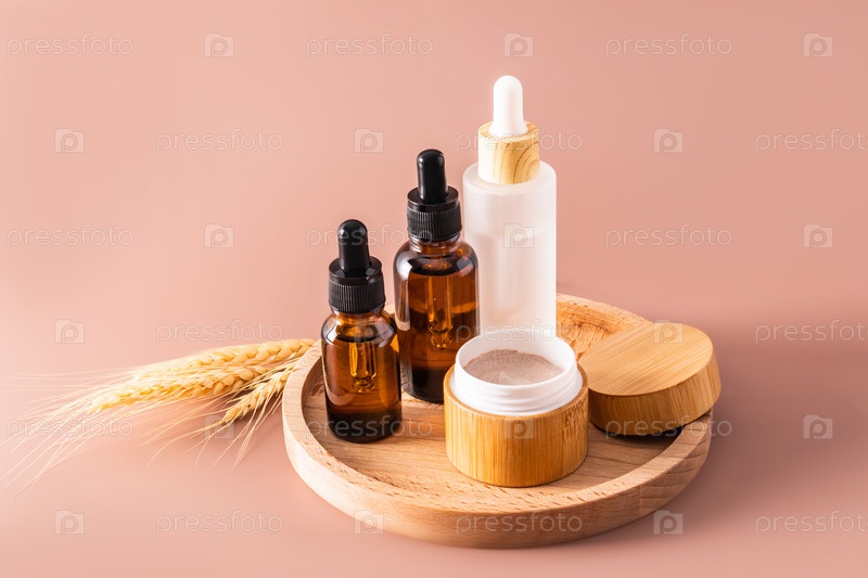 Многофункциональная увлажняющая сыворотка и крем для ухода за кожей лица и тела в косметическом наборе из натуральных средств по уходу за собой. Коричневый фон