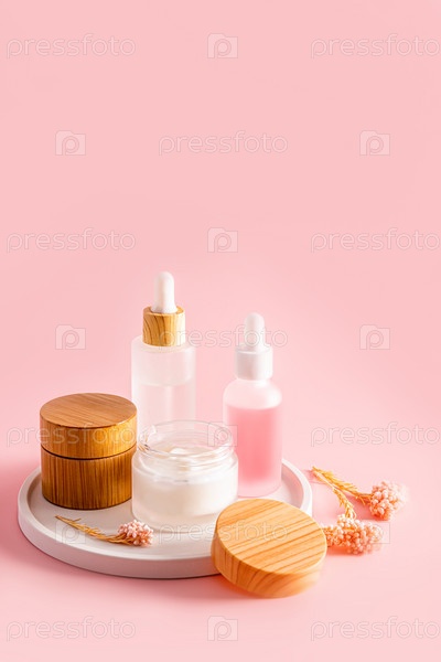 Натуральная косметика в бутылках из матового стекла и банка с бамбуковой крышкой на белом подносе. Вертикальный вид. Розовый фон. Копия пространства