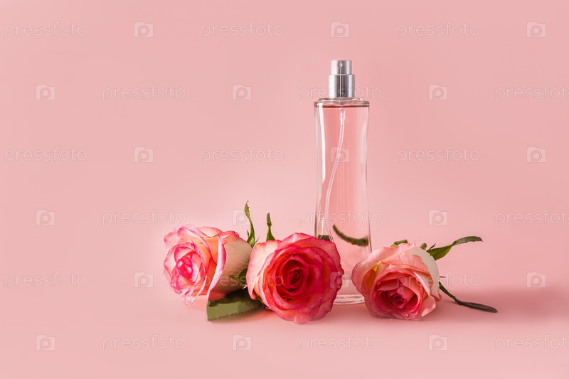 Элегантная прозрачная бутылка косметического парфюмерного продукта на розовом фоне с копией пространства и тремя свежими розами