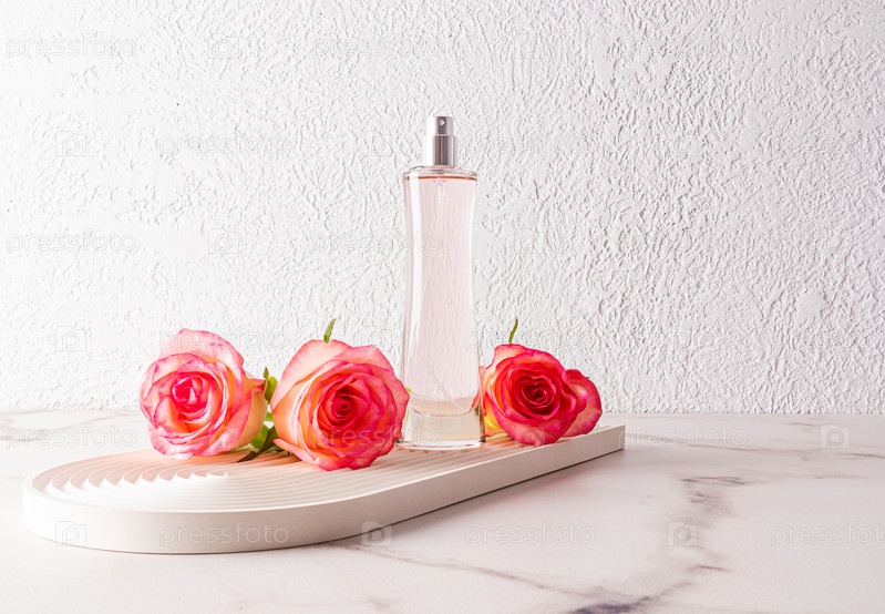 Элегантный флакон женских духов или туалетной воды стоит на декоративном подносе с живыми розовыми розами. Шаблон для рекламы продукта