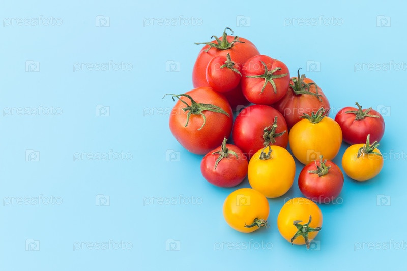Свежие помидоры. Вкусная и здоровая еда. Еда. Желтые и красные помидоры разных размеров. Синий фон
