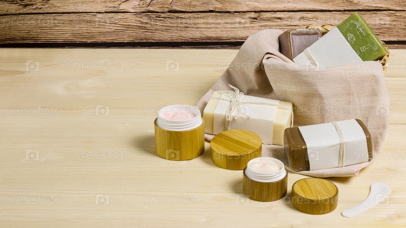 Органическая косметика. Натуральное мыло в корзине. Крем в бамбуковой упаковке. Уход за телом и лицом. Хоп полотенце и салфетка. Композиция на деревянном фоне
