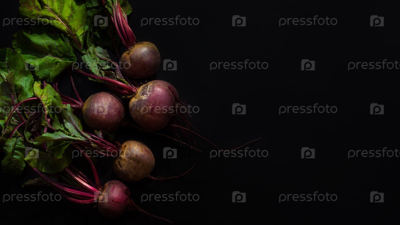 Свежая свекла на черном фоне. Красная свекла с листьями. Здоровая пища. Вид сверху. Место для вашего текста и дизайна