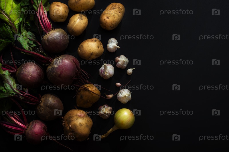 Набор овощей на черном фоне. Свекла, картофель, лук и чеснок. Овощи для приготовления пищи. Вид сверху. Черный фон