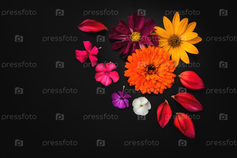 Яркие цветы на черном фоне. Цветок календулы, космос, флокс. Лепестки георгин. Цветочная открытка. Цветы из сада