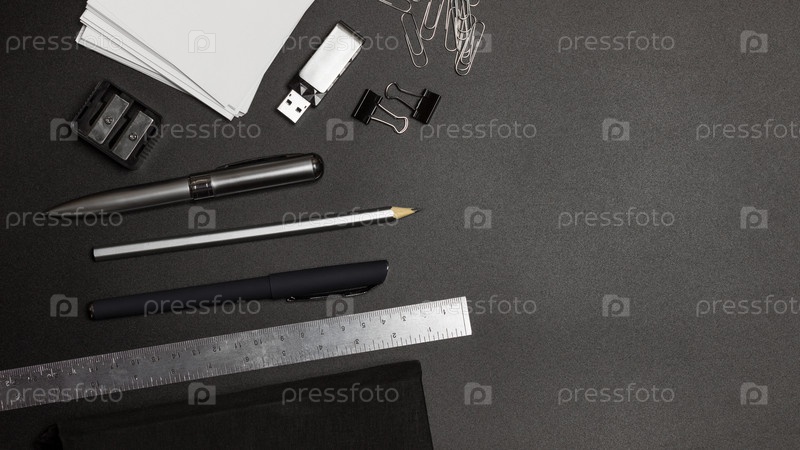 Набор канцелярских товаров на черном фоне. Шаблон для теста. Плоский офис