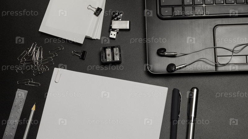 Канцелярские товары на черном фоне. Рабочая среда. плоская планировка