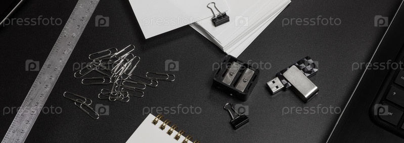 Рабочая среда. Офисный черный стол с канцелярскими принадлежностями. Концепция бизнеса и финансов. Линейка, скрепки, ручки, ноутбук. Темный фон. Плоская планировка