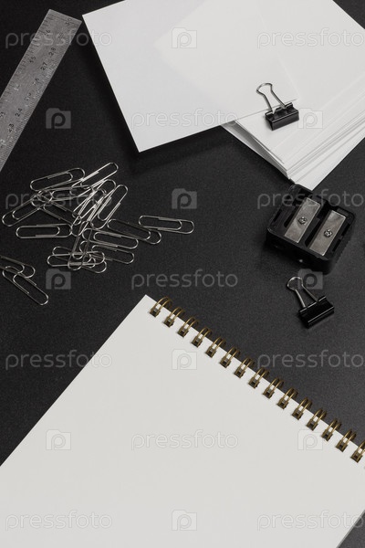 Рабочая среда. Офисный черный стол с канцелярскими принадлежностями. Концепция бизнеса и финансов. Линейка, скрепки, ручки, ноутбук. Темный фон. Плоская планировка