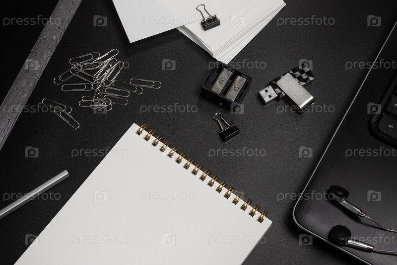 Рабочая среда. Офисный черный стол с канцелярскими принадлежностями. Концепция бизнеса и финансов. Линейка, скрепки, ручки, ноутбук. Темный фон. Плоская планировка