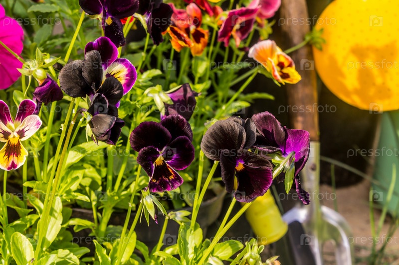 Анютины глазки, розовые петунии, астры. Цветы в вазонах. Инвентаризация страны. Зеленая лейка, белые перчатки, совок и измельчитель