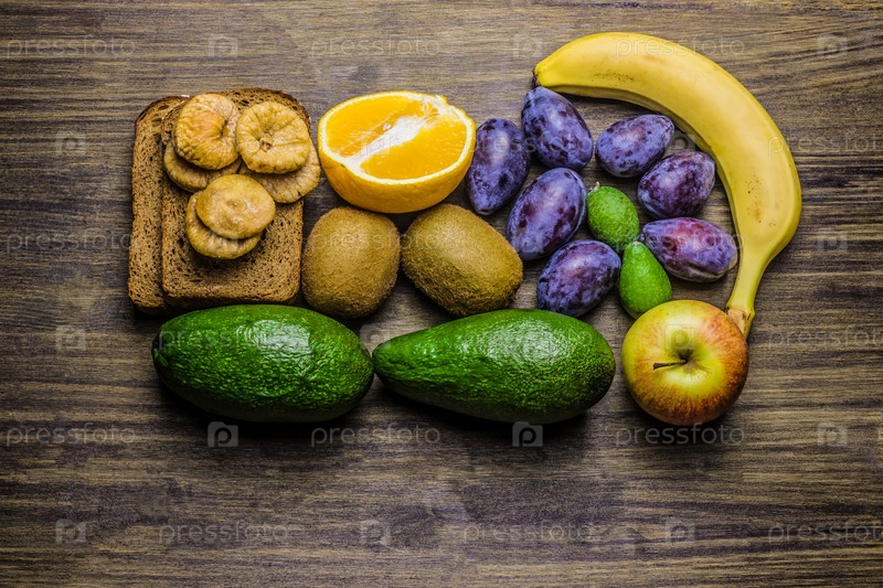 Здоровая пища. Выбор здорового питания. Ассорти из фруктов, сухофруктов и хлеба. Банан, яблоко, слива, фейхоа, киви, апельсин, инжир