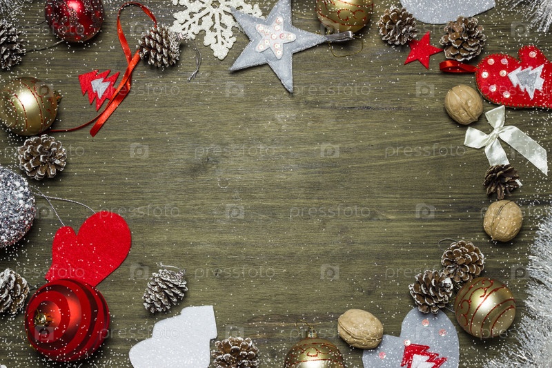 Новогодний фон с праздничным декором на деревянном фоне. Плоский дизайн. Скопируйте пространство