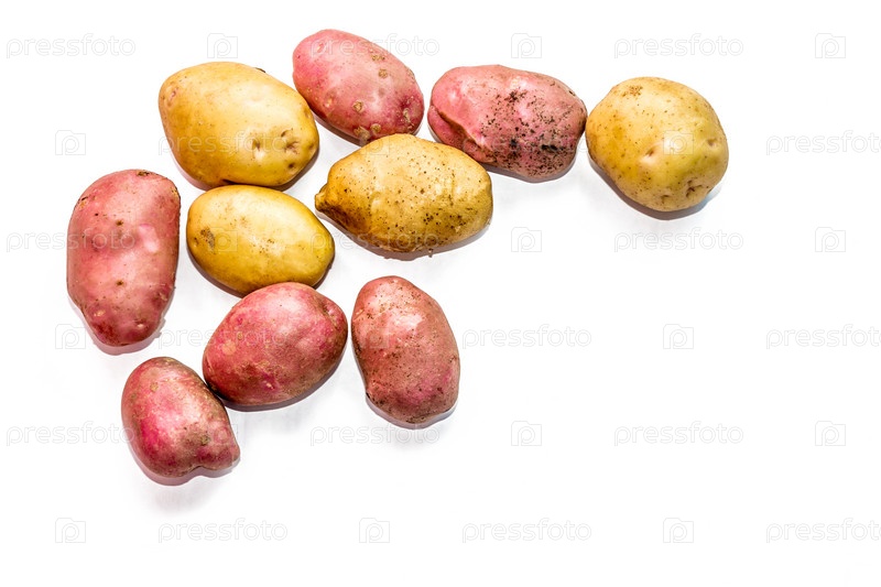 Картошка на белом фоне из огорода на даче. Картофель в ассортименте. Красно-алый, Гала