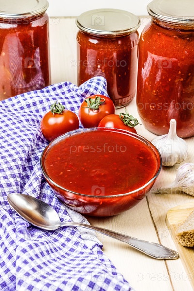 Томатный соус в стеклянной посуде. Томатный соус в банках. Спелые помидоры и чеснок. Клетчатое полотенце и ложка. Нереализованная таблица. Деревенский стиль. Деревенский