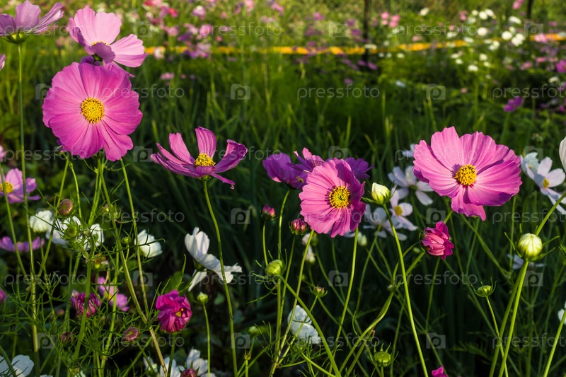 Космея розовые цветы в саду на фоне зелени. Солнечный вечер. Закат. Романтическое место
