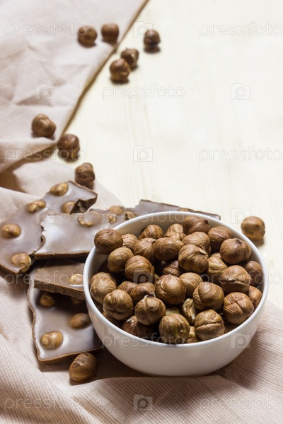 Фундук очищенный. В фарфоровой посуде. Молочный шоколад с целым фундуком. Кусочки шоколада. Светлый деревянный фон. Легкое полотенце
