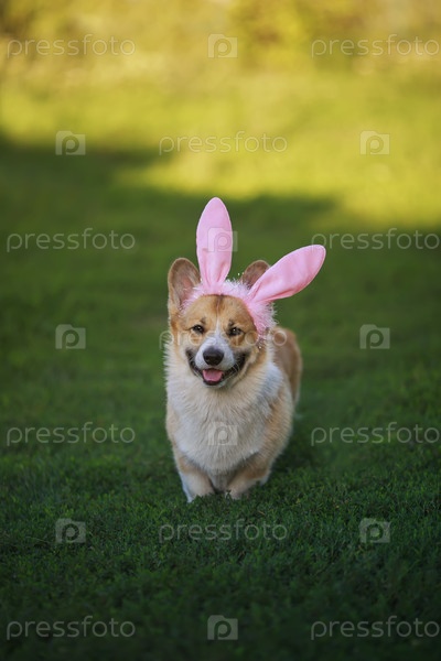 Милый щенок корги в ушах пасхального кролика стоит на зеленой траве в солнечном саду