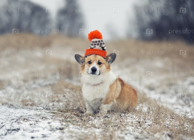 Смешной щенок корги сидит в зимнем парке в вязаной теплой шапке под падающим снегом