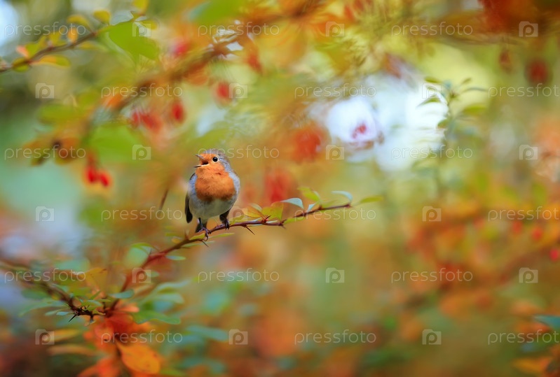 Яркая малиновка сидит на ветке барбариса в осеннем саду среди золотой листвы